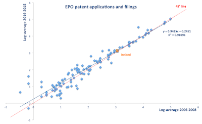 Some of the readers have taken me to task on the second point, despite the fact that my evidence (based on EPO data) shows no gains in Irish patenting activities with the EPO in terms of both applications and filings, and in comparative terms as a share of both in the total number of EPO applications and filings.