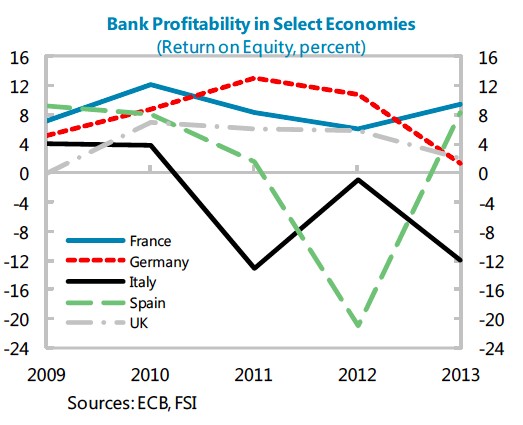Worse. Pressure on assets side is not limited to the 'periphery'. German banks held EUR7.6 trillion in total assets at the end of 2012, followed by the French banks with EUR6.8 trillion. Spain and Italy's banking sectors came in distant second and third, with EUR3.9 trillion and EUR2.9 trillion in total assets.