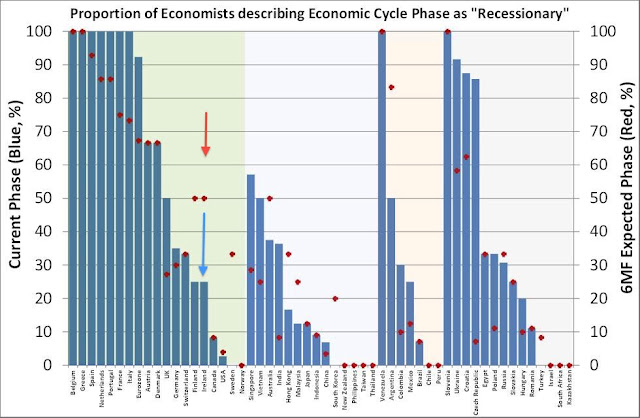 Blue bars reflect consensus on current phase of economic development (for example, in Ireland's case, current phase is seen as being recessionary by roughly 25% of respondents to the survey). Red dot corresponds to 6mo forward expectation (in Ireland's case, 50% of respondents expect recession in Ireland to either continue or to present itself again in 6 months time).