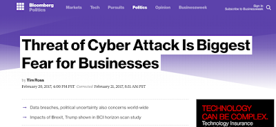 An interesting insight via https://www.bloomberg.com/politics/articles/2017-02-21/threat-of-cyber-attack-is-biggest-fear-for-businesses-survey on the rising importance of the cyber-security risks and changing business perceptions of the risk. Goes handily with our findings here: http://trueeconomics.blogspot.com/2017/01/23117-regulating-for-cybercrime-hacking.html.